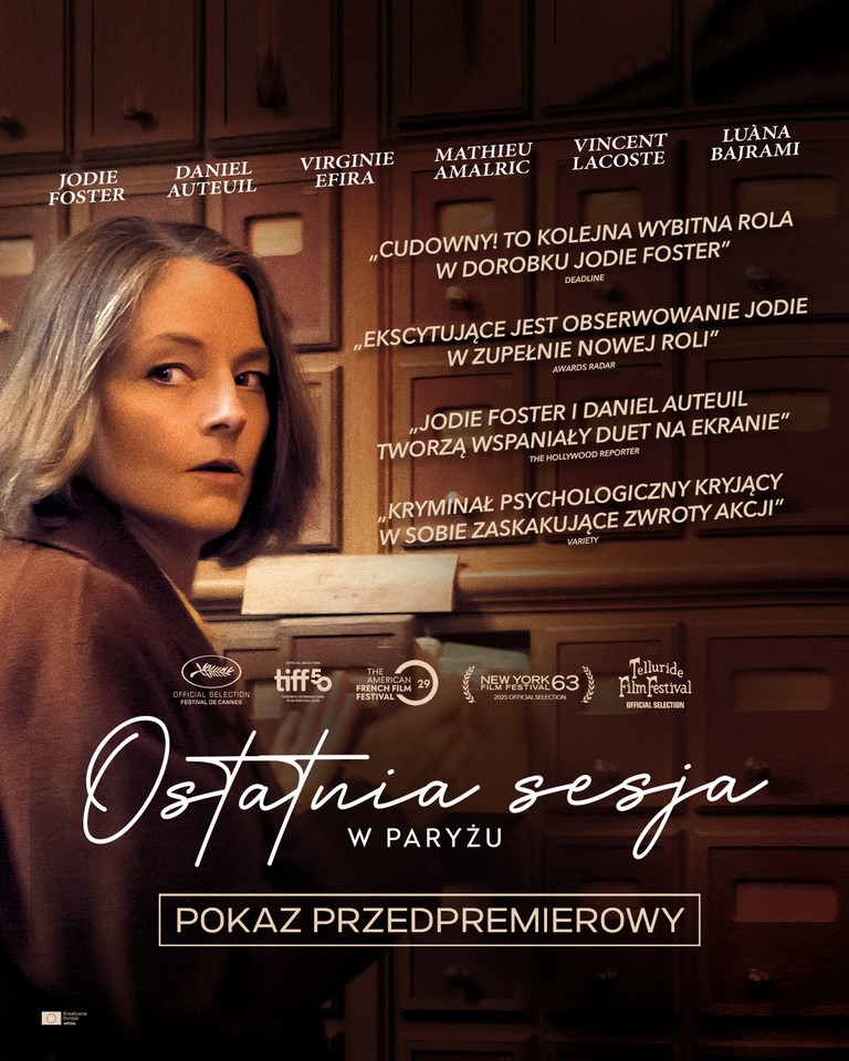 Lilian (laureatka Oscara Jodie Foster) jest cenioną psychiatrą prowadzącą własną praktykę w Paryżu. Jej uporządkowany świat zaczyna się rozpadać po nagłej śmierci wieloletniej pacjentki. Czy było to samobójstwo, morderstwo, a może tragiczna pomyłka lekarska? Dręczona wątpliwościami i poczuciem winy Lilian rozpoczyna prywatne śledztwo, wciągając w nie byłego męża (Daniel Auteuil). "Ostatnia sesja w Paryżu" to błyskotliwy kryminał psychologiczny, w którym napięcie miesza się z groteską, a rozwiązanie tajemnicy staje się intrygującą grą i konfrontacją bohaterki z samą sobą…