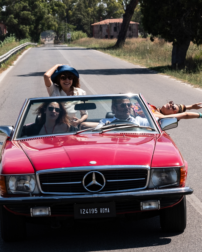 [Kolorowy kadr z filmu. Cztery osoby, trzy kobiety i mężczyzna, jadą czerwonym kabrioletem pustą ulicą.]
